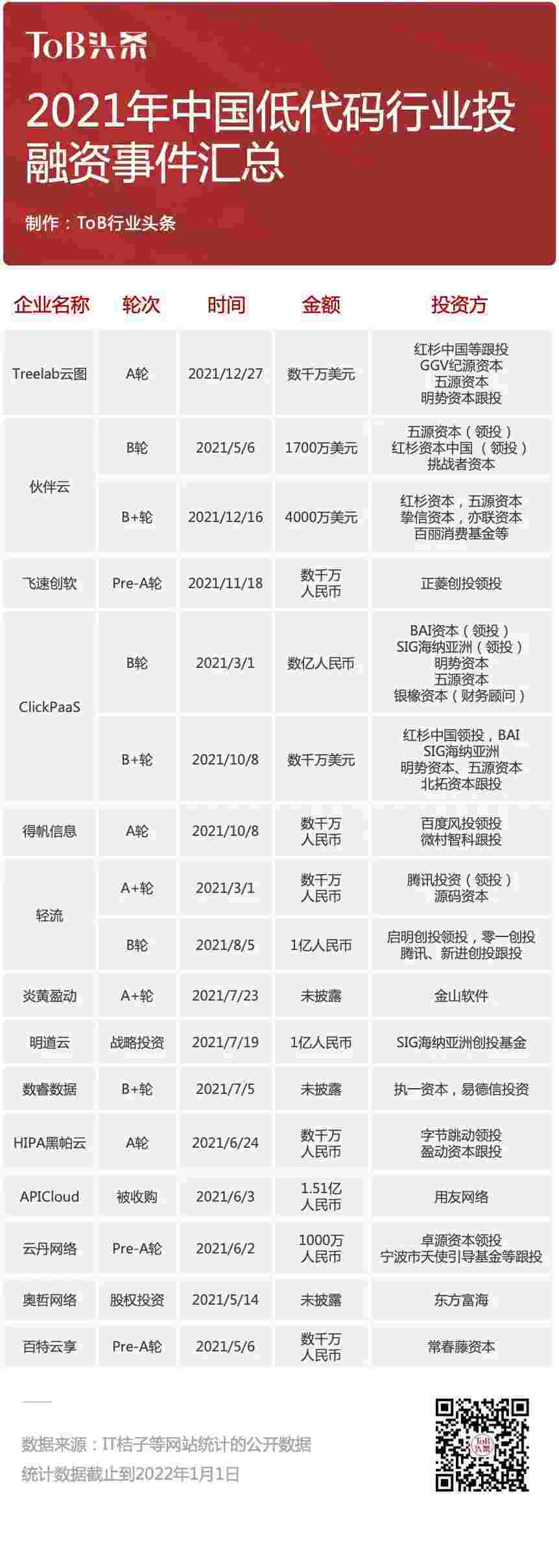 到2021年,,,无/低代码投融资规模势头更甚,,,其中包括轻流两轮融资(A+轮数千万人民币,,,,B轮近亿人民币)、、、、小米钱包 两轮融资(B轮数亿人民币,,,B+轮数千万美元)、、、百特云享数千万元Pre-A轮融资......